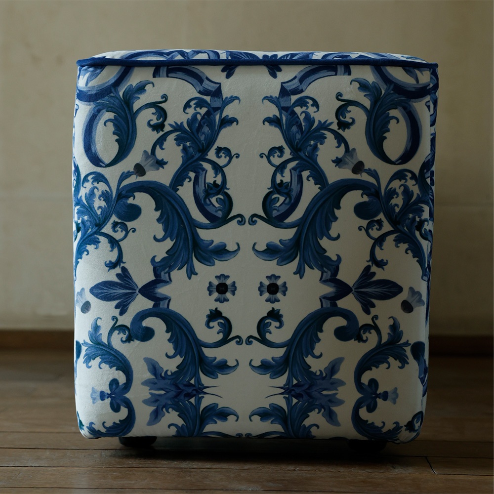 The rich upholstery, in shades of white and cobalt blue, features baroque and floral motifs that evoke the traditional craft of hand-painted ceramic tiles. These details create an object that goes beyond mere utility, becoming a true textile art piece integrated into contemporary design.
